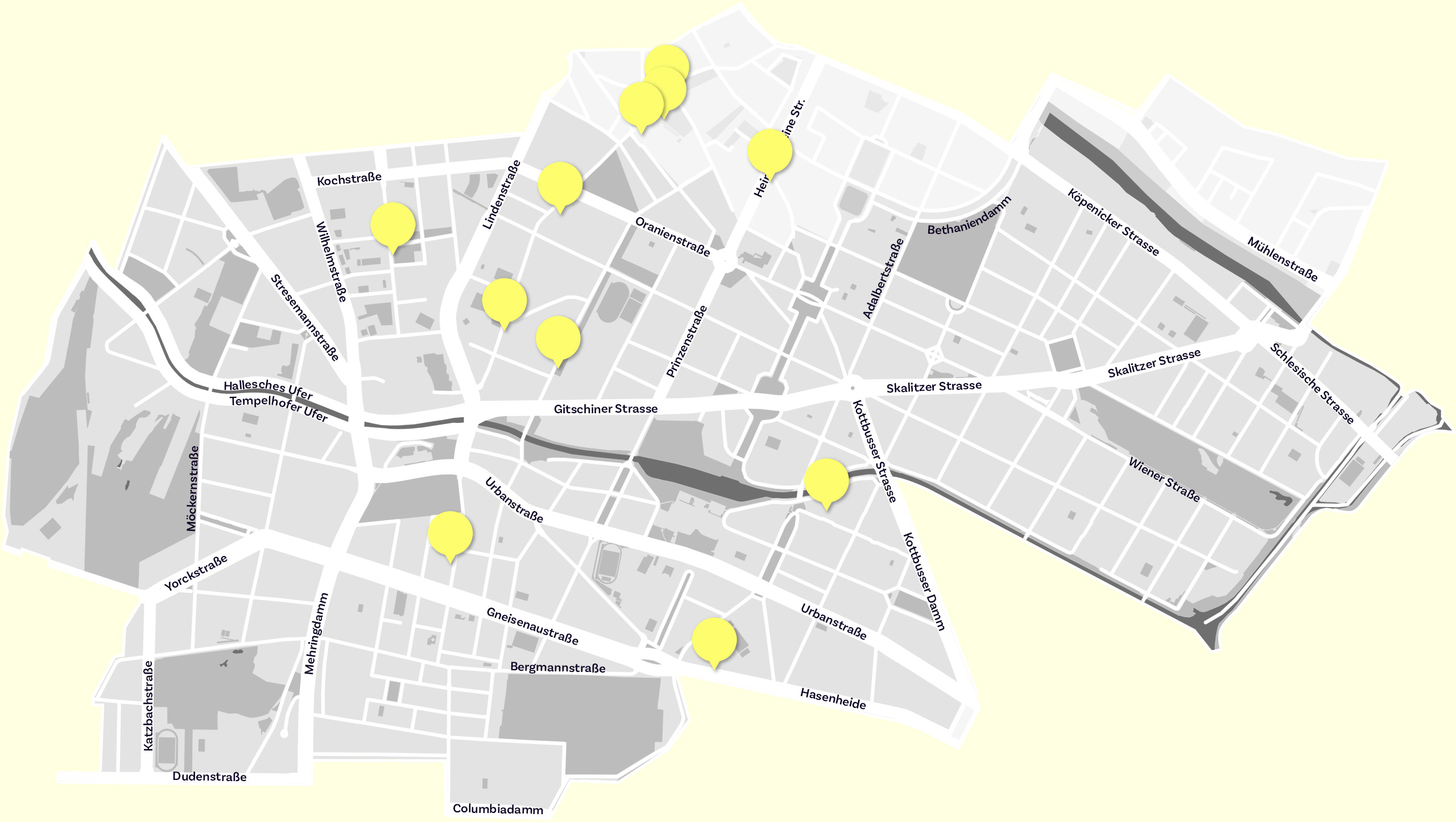 Im Folgenden werden verschiedene Orte queeren Lebens in Kreuzberg betrachtet. Durch die Forschung ist bekannt, dass es hier viele Treffpunkte, Vereinssitze und Verlage queerer Menschen gegeben hat und dass auch Ansichtskarten existieren, die queeres Leben abbilden. Doch in der Ansichtskartensammlung von Peter Plewka finden sich kaum Abbildungen dazu. Um einen Umgang mit dieser Leerstelle zu finden und den wenigen Spuren nachzugehen, die in der Sammlung zu entdecken sind, werden auch Ansichtskarten herangezogen, die die Umgebung dieser Orte zeigen, nicht aber die Orte selbst.