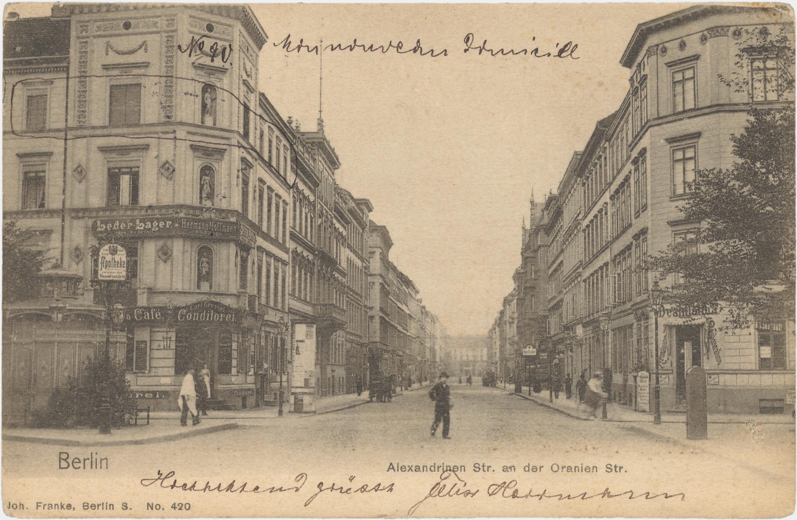 Ansicht der Kreuzung Alexandrinenstraße/Oranienstraße, o.J., Verlag: Joh. Franke, Sammlung: Peter Plewka / FHXB Friedrichshain-Kreuzberg Museum, 0046v. In der Alexandrinenstraße 8, in Nähe zur abgebildeten Straßenecke, wurde eine der bekanntesten queeren Zeitschriften, Die Freundschaft, gedruckt.